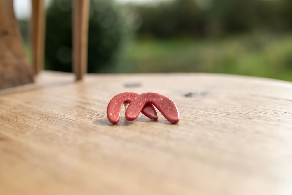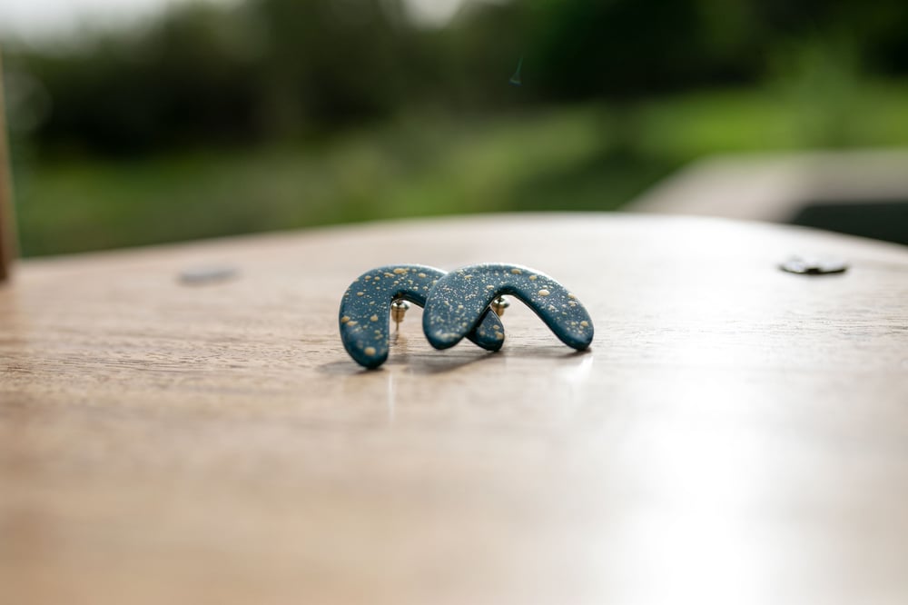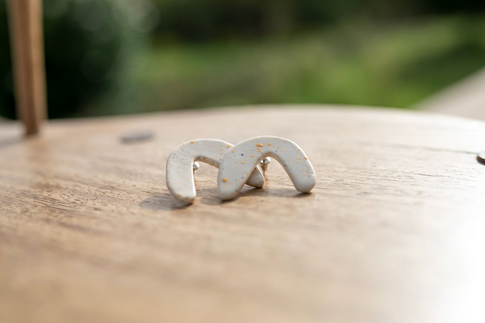 Brincos em barro de alta temperatura (gres) com junção de corantes. Vidrados com vidrado transparente com salpicos dourados.