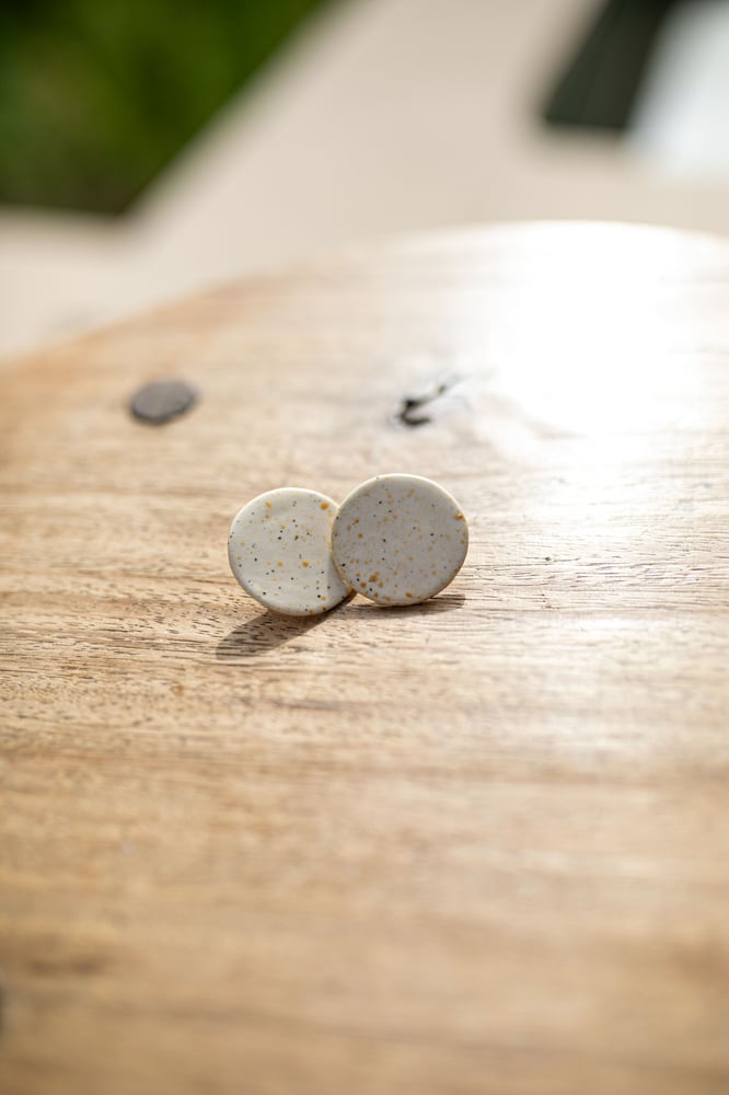 Brincos em barro de alta temperatura (gres) com junção de corantes. Vidrados com vidrado transparente com salpicos dourados.