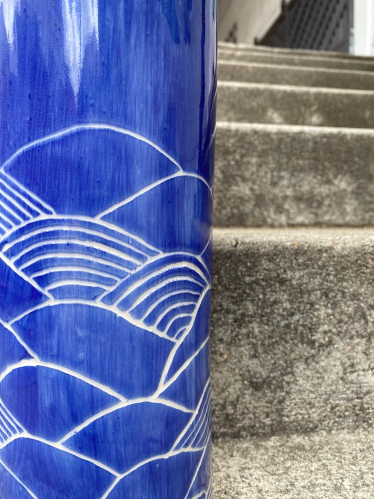 Jarra de flores pintada a azul cobalto com desenhos cravados. Totalmente feito à mão, com barro de alta temperatura (gres) e pintados a mão. Vidrados com vidrado transparente brilhante.