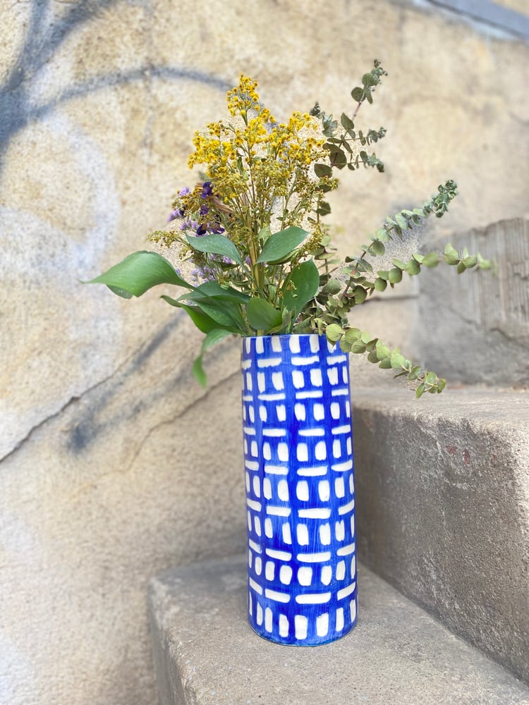 Jarra de flores pintada a azul cobalto com desenhos cravados. Totalmente feito à mão, com barro de alta temperatura (gres) e pintados a mão. Vidrados com vidrado transparente brilhante.