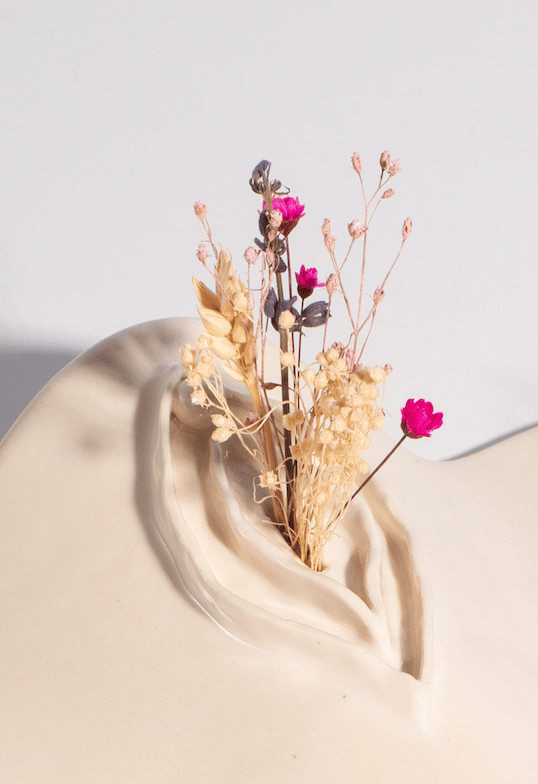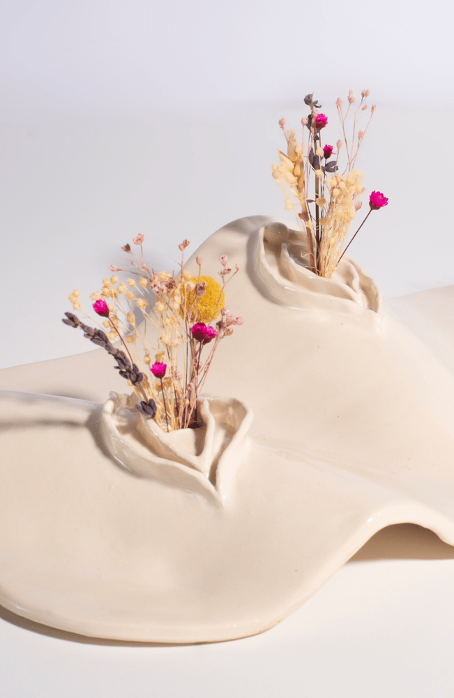 At the top of the piece, three sculpted vulvas represent the phases of the female cycle: creation, transformation and renewal. Small flowers sprout from each one, suggesting the vital force and deep connection between the female body and the earth.